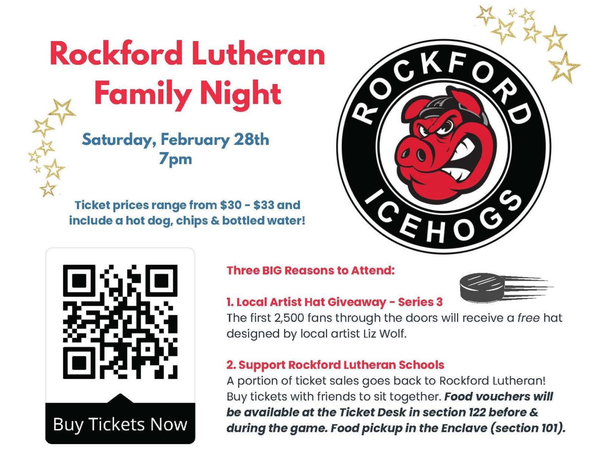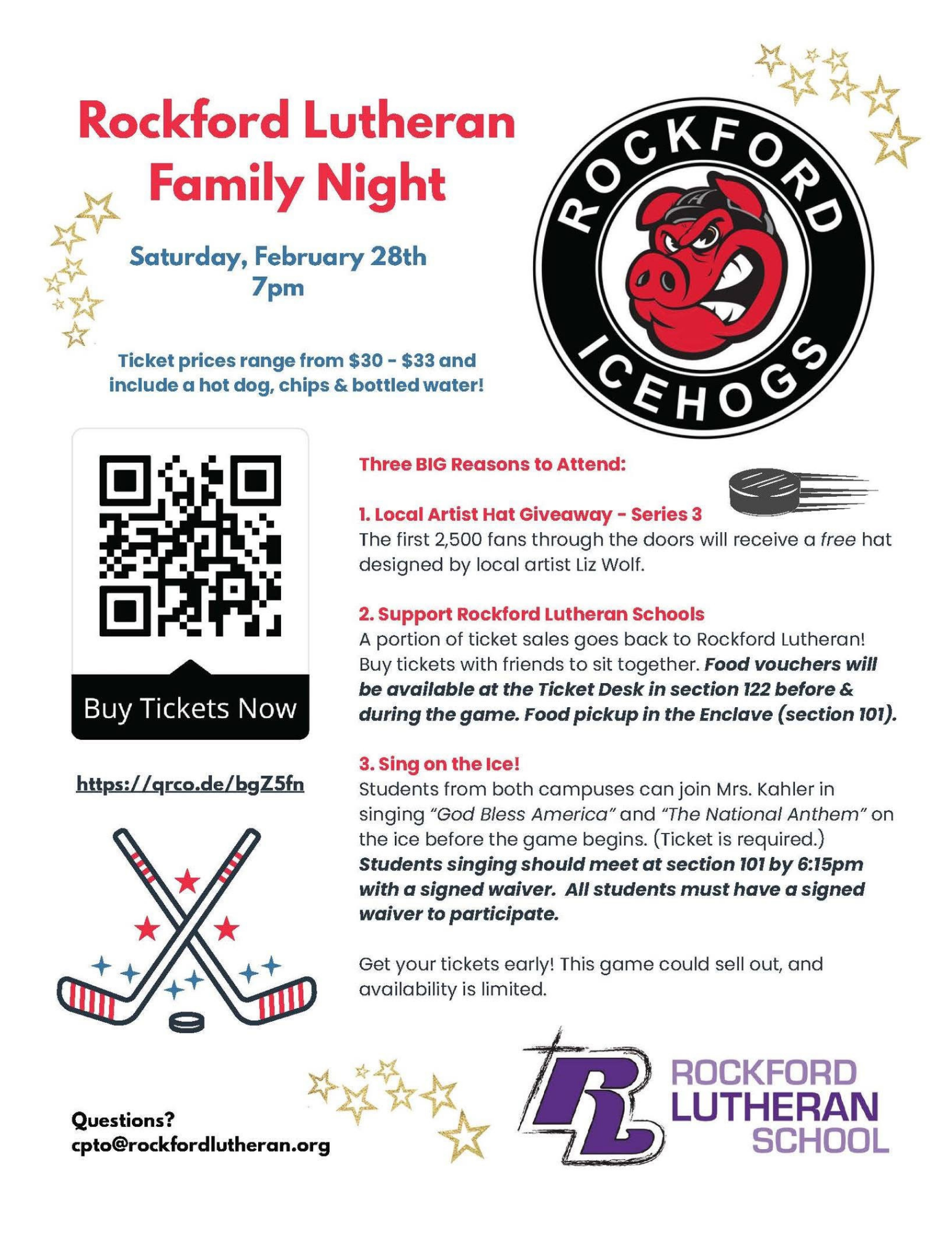Cheer on the IceHogs this Saturday Feb 28th as the RLS choir sings the national anthem. Special RLS tickets are only $32 and include seat, hat, hotdog, chips, water. Visit https://tinyurl.com/hockey26